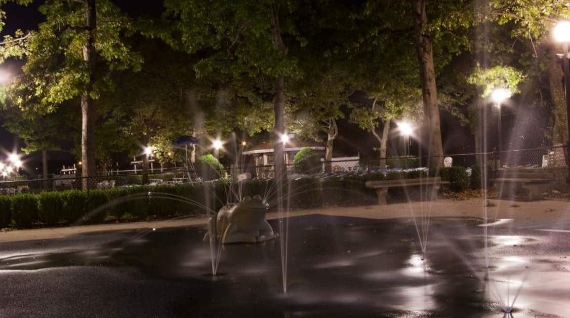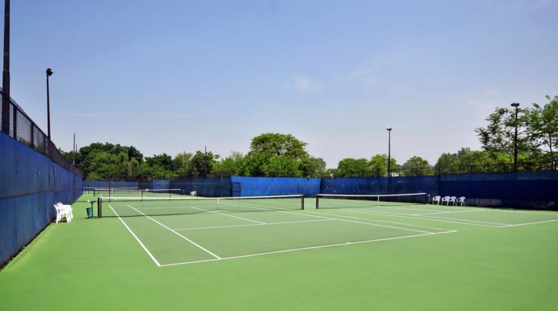 Immaculately maintained tennis courts, children’s sprinklers, and basketball courts.